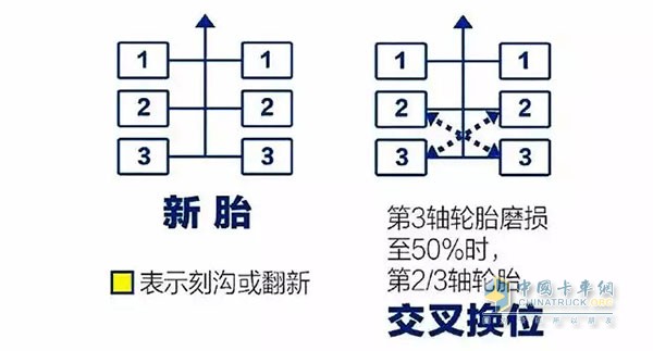 以牽引車為例,轉向軸上的輪胎,建議磨損度在50%左右的時候,將左右輪胎進行調換。而驅動軸上的輪胎,如果是驅動軸車輛,建議在外側輪胎磨損度到80%的時候,將內外側的輪胎進行調換。