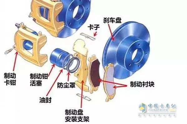 氣室固定在制動器的底板上固定不動,制動鉗上的兩個摩擦片分別裝在制動盤的兩側,氣室的活塞受氣管輸送來的氣壓作用,推動摩擦片向制動盤發生摩擦,就好像用鉗子鉗住旋轉中的盤子,達到減速剎車的作用。