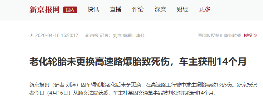 因此,問題胎、老化胎不換這種忽視輪胎安全的抵制聲音越來越高,甚至上升到了法律層面。近期,北京順義法院審理了一起“輪胎老化導致爆胎,引發(fā)死傷”的案子。