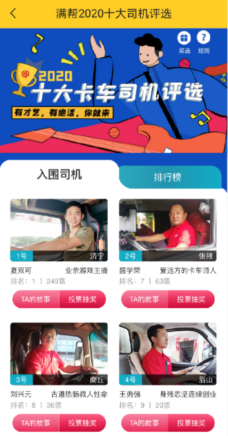 9月8日-9月24日,2020滿幫十大卡車司機進入票選環節,司機朋友可以通過貨車幫&運滿滿app了解司機才藝詳情,為入選司機投票,9月底將評選出2020年滿幫十大卡車司機,并于10月下旬在貴陽舉辦頒獎盛典。