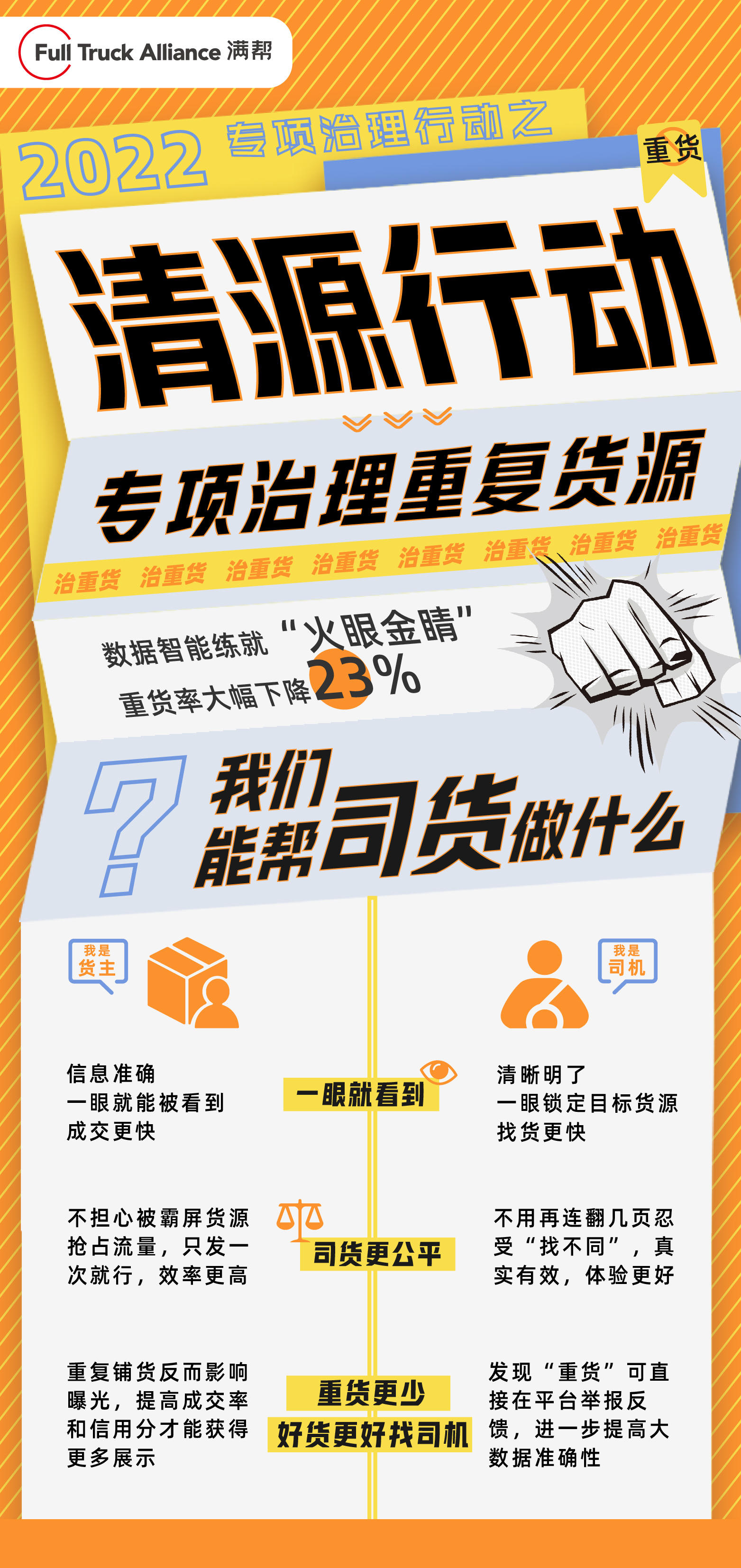 好消息來了,5月23日,繼阻擊低價貨源、打擊倒賣貨源的“春風(fēng)行動”之后,運(yùn)滿滿和貨車幫兩大平臺又正式啟動了針對網(wǎng)絡(luò)貨運(yùn)市場亂象的“重貨”專項(xiàng)治理行動——“清源行動”。