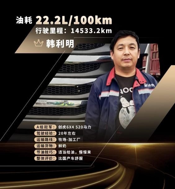 作為專注于長途運輸的老司機、現代創虎的忠實用戶,B組總冠軍蘇創洪在賽后接受采訪時表示,在周排名中自己與周冠軍僅差0.5升,通過調整駕駛習慣后竟然將成績反超,興奮之情難于言表。他將成績歸功于駕駛技能和車輛節油性能,并分享了個人節油“小妙招”。他說開車時不要猛踩油門,行車過程中要觀察路況提前預判,換擋時轉速一般控制在1100轉左右,輕踩油門進行加速。此外,他對現代創虎也給予了高度評價。現代創虎的自動擋變速器具備的低阻條件行駛功能,遇到極端天氣或者濕滑路面能有效防止輪胎打滑,確保安全性。此外,下坡時按下打開智能滑行功能,即可松開油門踏板,幫助用戶省時省力,更省油。不止如此,在用車過程中,現代的售后服務也給蘇創洪留下深刻印象,尤其在他成為創虎用戶后第一次路遇事故,現代服務團隊第一時間趕赴現場,整個處理過程非常規范且及時,幫助他以最短的時間重新投入運營,確保了運輸的時效性。