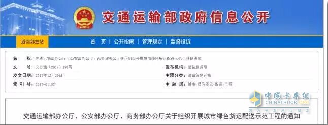 2017年12月26日,交通部、公安部、商務部聯合發布關于組織開展城市綠色貨運配送示范工程的通知。將優化城市配送車輛便利通行政策,推廣應用新能源城市配送車輛。