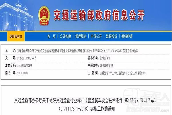 近日,交通運(yùn)輸部發(fā)布行業(yè)標(biāo)準(zhǔn)《營運(yùn)貨車安全技術(shù)條件 第1部分:載貨汽車》(JT/T 1178.1-2018),自2018年5月1日正式實施。